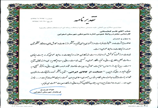 بمناسبت 27 اردیبهشت روز ملی ارتباطات و روابط عمومی فرماندار اسفراین با اهداء تقدیرنامه از زحمات یکساله مسئول روابط عمومی شبکه دامپزشکی اسفراین تقدیر بعمل آوردند .